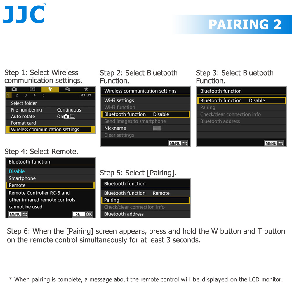 (1) Enable Bluetooth in camera menus (Menu - Setup tab - Wireless communication setting - Bluetooth function - Remote) (2) Select "pairing" (3) Hold down both the W and T zoom buttons on the remote simultaneously for more than 3 seconds (4) When the camera asks if you'd like to pair with the remote, tap "OK"