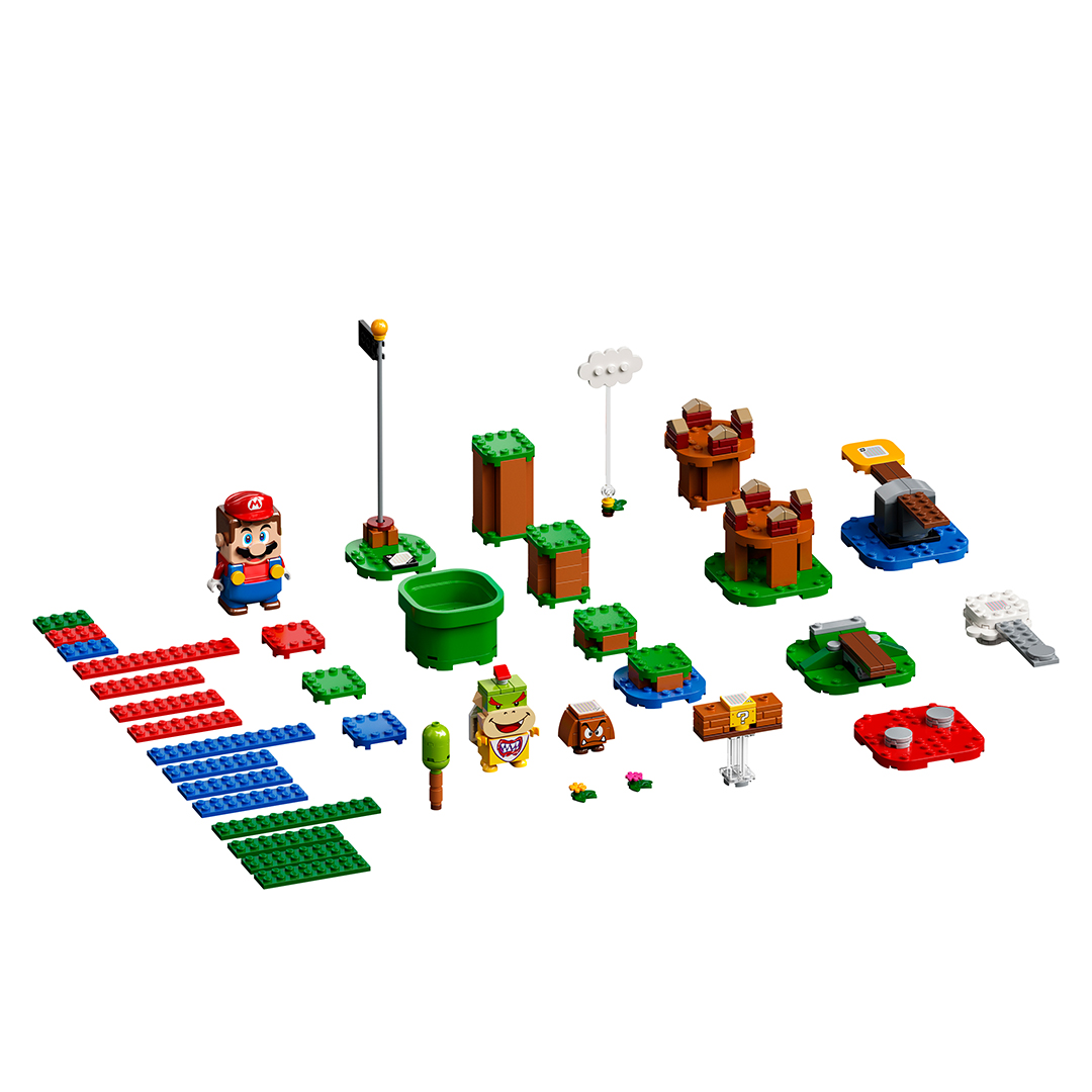 See how LEGO® Mario™ reacts in real life as you take on this LEGO® Super Mario™ Starter Course! Build your level and help Mario collect coins. Spin on the platform… but don’t fall off! Fly on the cloud. Get extra coins and a Super Star with the ? Block. Jump on the Goomba and stomp Bowser Jr. on the back to earn coins. Compete against friends and then rebuild to create new challenges!