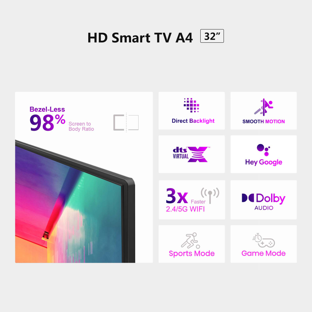 Hisense A4 32" 40'' Android TV | Google Play | Android 11 | Dual Wifi 2.4+5G | DTS Virtual X | Dolby Audio | Bezelless | Smart TV | Bluetooth Remote | Youtube | Netflix | Disney+ | Google voice contro