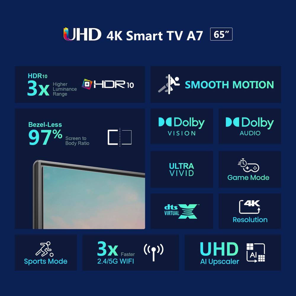 [Exclusive] Hisense A7 65" 4K Android TV | Google Play | Dolby Vision | DTS Virtual X | Dolby Audio | HDR 10 | Smooth Motion | Ultra Vivid | Youtube | Bluetooth Remote | Smart TV | Dual Wifi 2.4+5G |