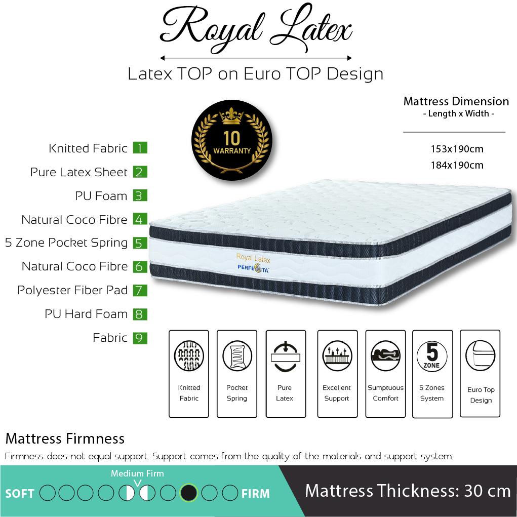 [Bulky] Queen Size - Perfecta Royal Latex 5 Zone Pocket Spring with Natural Latex Top on Euro TOP Design 12 Inch Mattress