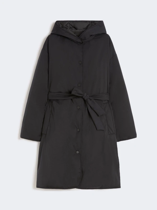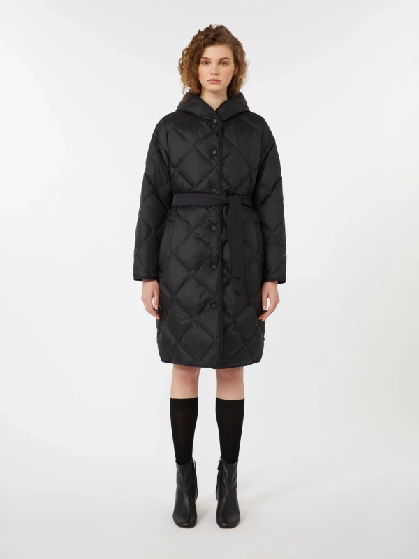 Reversible down jacket with robe silhouette and matching belt at the waist.